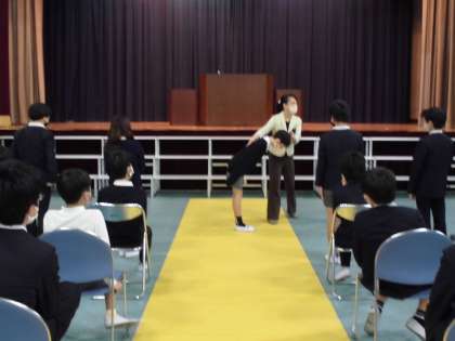 2日前の5年生に続いてのマナー向上教室では、歩き方やお辞儀などの立ち居振る舞い、美しい姿勢について学びました。一生懸命に話を聞き、美しい所作をしていました。卒業式でかっこいい姿を見せられるように、みんな頑張っていました。