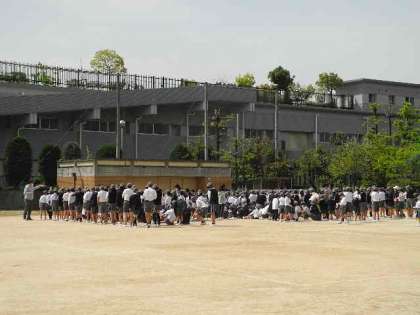 理科室からの出火という想定で、避難訓練を行いました。1年生にとっては初めての訓練で、全員の避難完了まで4分10秒かかりました。避難訓練は学期に1回ずつ予定しています。