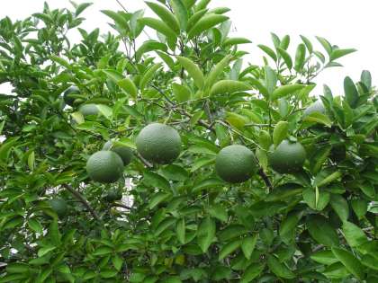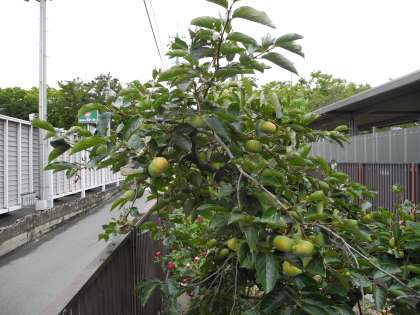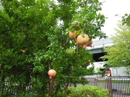 小学校の中央環状線側にある果樹園です。もうじき秋、いろんな果物の実も大きくなってきました。