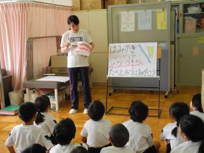 歯の働きや虫歯のでき方、虫歯を防ぐ方法などについて、わかりやすく話をしてくれました。1年生は、みんなよく聞いていました。