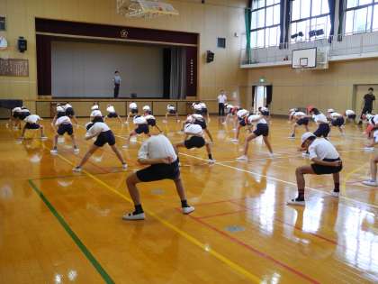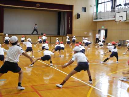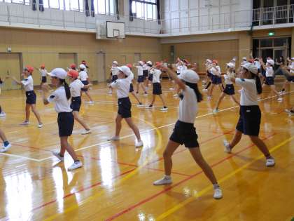 5年生の運動会の団体演技は「南中ソーラン」です。腰を低くおとす動作は、たいへんそうですが、「どっこいしょ!どっこいしょ!」と、大きな声を出して頑張っています。