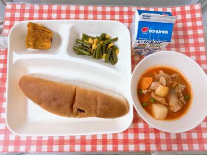 【ケチャップ煮、さんどまめとコーンのソテー、焼きかぼちゃの甘みつかけ、レーズンパン、牛乳】