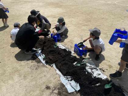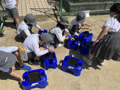 まず植木鉢に土を入れ、ゆびで土に4つのあなをあけました。そして、そのあなに種を1つずつ入れてから土をやさしくかけ、土全体に水をかけて今日の作業は終わりました。