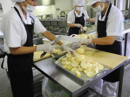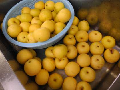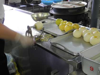 今日の給食の果物は、梨(二十世紀)。給食調理員さんが皮をむく器械を使って、梨を食べやすく準備してくれていました。