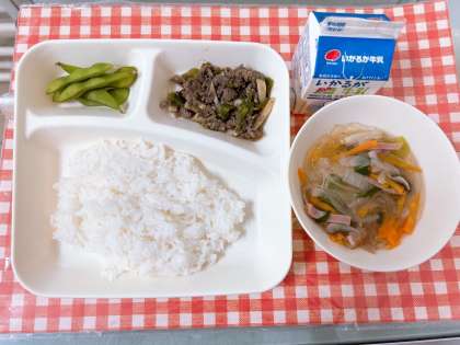 【チンジャオニューロウスー、ハムと野菜の中華スープ、えだまめ、ごはん、牛乳】