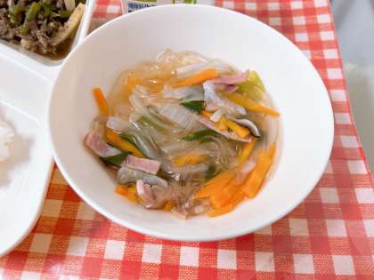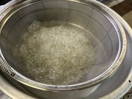 写真は、中華スープに入っている春雨です。1度ゆでて、水でさらしてから、スープに入れています。