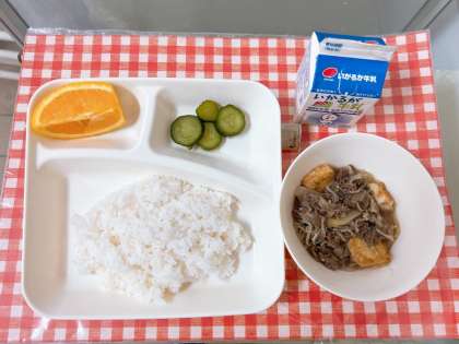 【すき焼き煮、きゅうりのしょうがづけ、オレンジ、ごはん、牛乳】