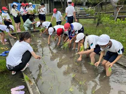 5年生は、『田植え』を行いました。紐の結び目を目印に、等間隔に苗が並ぶように、みんなで交代しながら『田植え』していきました。地域の方のアドバイスを聞きながら、上手に行っていました。田んぼのぬるぬる感にびっくりしていました。