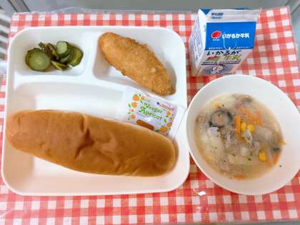 【アプリコットジャム、サーモンフライ、豆乳スープ、きゅうりのバジル風味サラダ、牛乳】