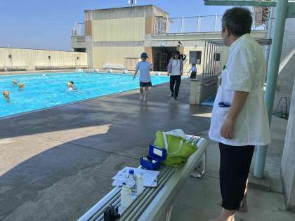 学校薬剤師の川上先生が、プールの水質検査をするために来校されました。このような検査もしながら、プールの水質が安全かを確かめながら日々プール水泳を行っています。