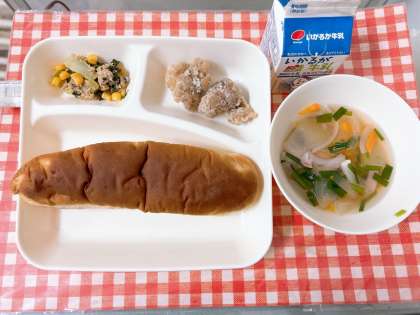 【鶏肉のからあげ、とうがんの中華スープ、ツナとチンゲンサイのいためもの、おさつパン、牛乳】