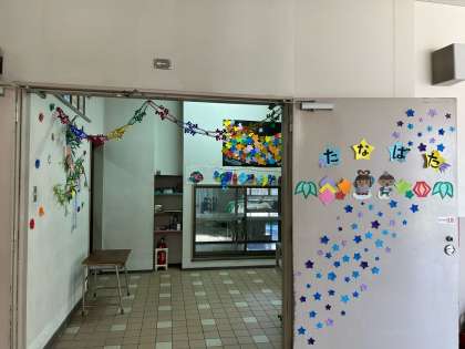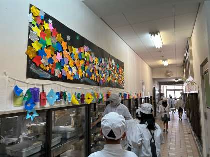 調理員さんが七夕のかざりで給食室を華やかにしてくれました。子どもたちにも折り紙でかざりを作ってもらいました。七夕のねがいがかなうといいですね!!