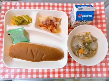 【鶏肉とてぼ豆のスープ煮、じゃがいもとトマトのチーズ焼き、グリーンアスパラガスとコーンのサラダ、コッペパン、りんごジャム、牛乳】
