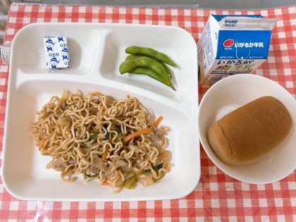 【オイスターソース焼きそば、えだまめ、固形チーズ、黒糖パン(小)、牛乳】