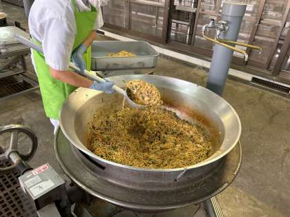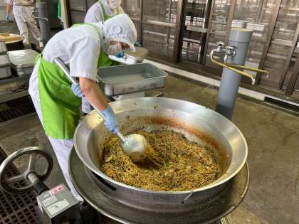 「オイスターソース焼きそば」は、子どもたちに人気のメニューでした。具材は、キャベツ、たまねぎ、にんじん、にらが入っています。味付けに、塩、こしょう、しょうゆ、テンメンジャン、オイスターソースを使用しています。