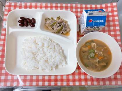 【豚肉の甘辛焼き、とうがんのみそ汁、金時豆の煮もの、ごはん、牛乳】