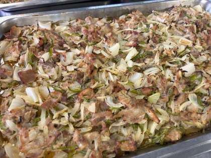「豚肉の甘辛焼き」は、豚肉に砂糖、塩、こいくちしょうゆで下味をつけ、たまねぎ、ピーマンと混ぜ合わせて、焼き物機で焼いています。