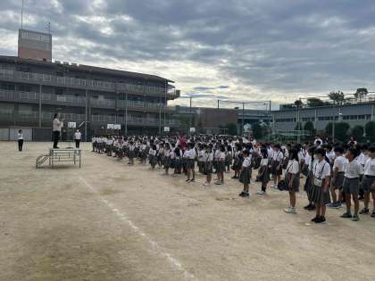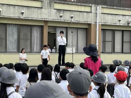 2学期最初の全校児童集会を運動場で行いました。本日より一週間教育実習として茨田小学校で一緒に過ごす西岡先生の紹介とあいさつがありました。短い期間なので、積極的に話しかけに行って欲しいなと思います。