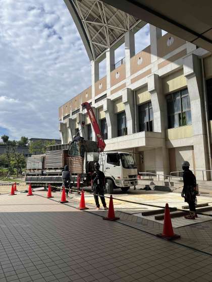 工事の足場となるものがトラックで搬入され、いよいよ工事も始まっていきます。