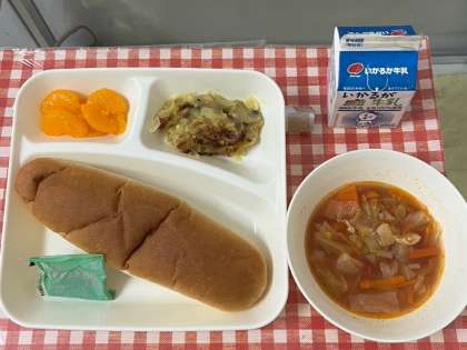 【豆乳マカロニグラタン[米粉]、トマトスープ、みかん(缶)、コッペパン、りんごジャム、牛乳】