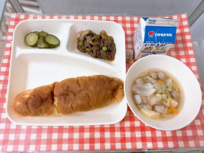 【牛肉のデミグラスソース煮、スープ、きゅうりのピクルス、おさつパン、牛乳】