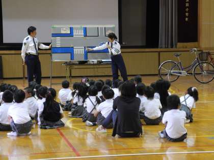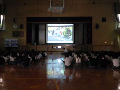 1・2年生は、歩行者の心得についてです。交通ルールのDVDを見たり、鶴見警察の方のお話(横断歩道の渡り方、道路の標識や交通ルールの確認)を聞いたりしました。