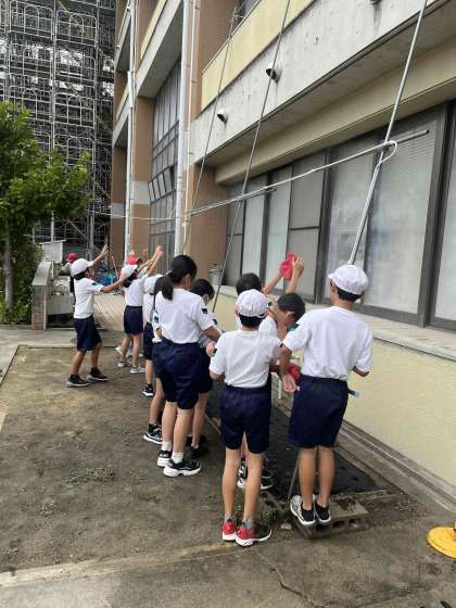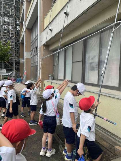 運動会に向けて、暑さに負けず、子ども達は元気にがんばっています。暑さ対策に、管理作業員さんが、『ミストコーナー』を設営してくれました。子ども達は、「気持ちいいー!」と言って、とても喜んでいました。