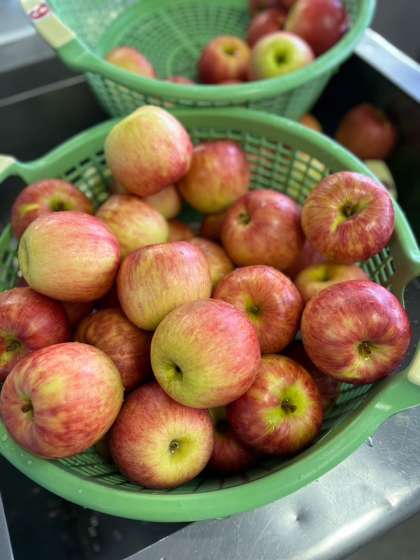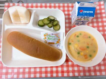 【豆乳コーンクリームシチュー[米粉]、きゅうりのバジル風味サラダ、りんご、コッペパン、アプリコットジャム、牛乳】