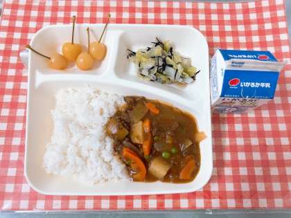 【ハヤシライス[米粉]、キャベツのひじきドレッシング、さくらんぼ(缶づめ)、牛乳】