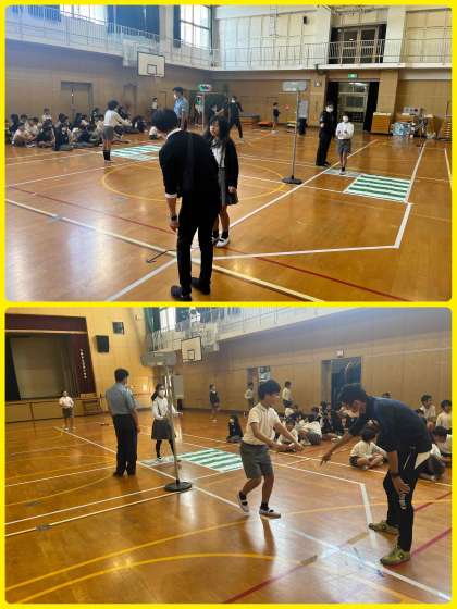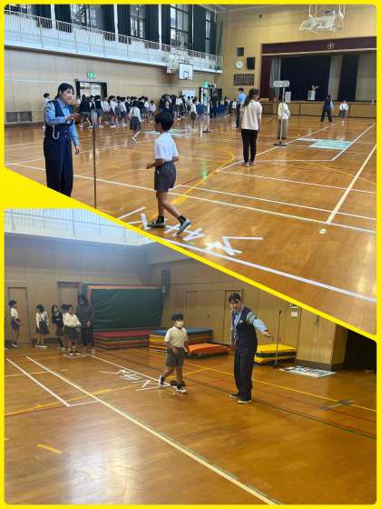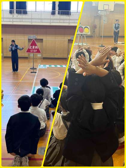 本日は大阪府警察本部交通課の方に来ていただき、1・2年生、3・4年生、5,6年生の3回に分けての交通安全学習を行いました。クイズも交えた楽しい学習で、子ども達はいきいきと学習していました。最後に歩行の仕方や自転車の乗り方を、講堂の中に作った道を実際に通って、体験型で学習しました。
