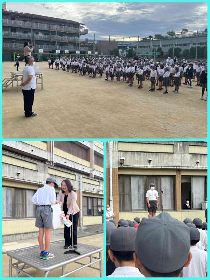 今日は月に1度の運動場で行う全校朝会の日でした。鶴見区主催のSDGsポスターコンクールの優秀賞の表彰がありました。また、今日から始まった『あいさつ週間』のお知らせが児童会からありました。気持ちの良いあいさつが茨田小学校いっぱいになることを期待しています。