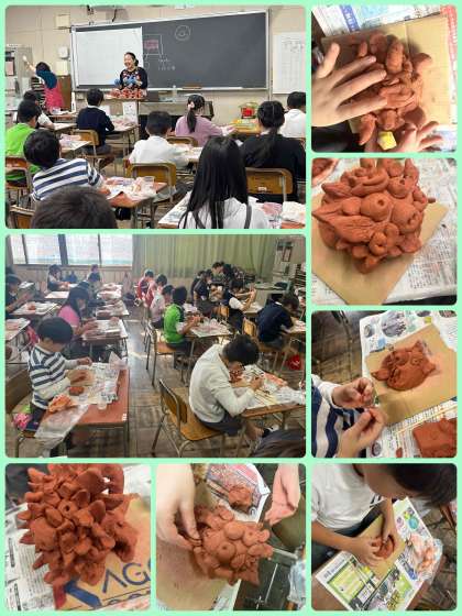 本日は校長先生が特別講師となって、4年生1組・2組で『シーサー作り』を学習しました。子ども達はとても集中して、楽しそうに取り組んでいました。色々な形の鼻や口、歯や目。ひげや模様。ひとりひとりが思い思いにつくって、様々な表情のシーサーができていました。このシーサーが作品展で展示されます。楽しみにしていてください。