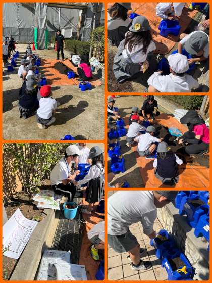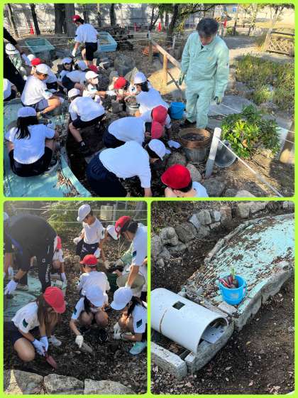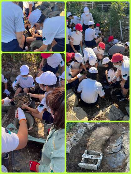 創立25年目を迎える茨田小学校.『すくすくの森』も創立当初からありました。しかし、ここ数年、昔は池としてあった場所が、水を溜めることができない状態になっていました。子ども達と一緒に、また『池をつくって生き物のすみかをつくる』ということで、再整備活動を始めました。まずは池の中を空っぽにする作業から始めています。子ども達はみんな一生懸命に働いていました。