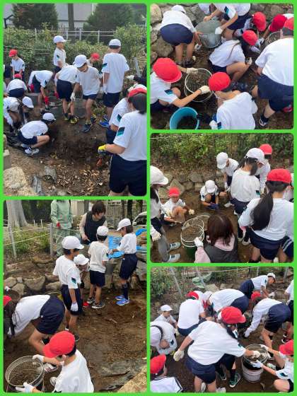 本日は4年生がビオトープ池の整備にがんばりました。池の底の土砂をふるいにかけ、石と砂に分けながらすくっていく作業をしています。先週の5、6年生に続き4年生も頑張りました。もう少しで池の土砂が空っぽになりそうです。