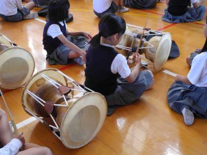 10月19日(月)に、近くの国の文化とふれあう活動の1つとして、民族講師の方に来ていただきました。韓国・朝鮮の文化や遊びについて教えていただきました。チャンゴを使ったリズム遊び、ハングルについて、簡単な遊びやゲームなど、子どもたちは楽しく活動しながら学ぶことができました。