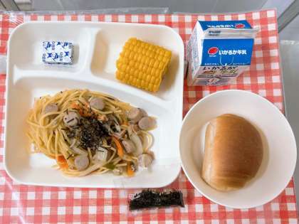 【ウインナーときのこの和風スパゲッティ、焼きとうもろこし、固形チーズ、黒糖パン(1/2)、牛乳】