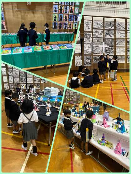 先週から本日にかけて、作品展の作品を各クラスが鑑賞する時間もつくっています。今日は1年生が鑑賞していました。お兄さん、お姉さんの作品はすごいなー!さすがだな!と感激した様子でした。