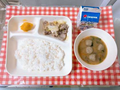【豚肉と野菜のいためもの、いわしのつみれ汁、かぼちゃういろう、ごはん、牛乳】