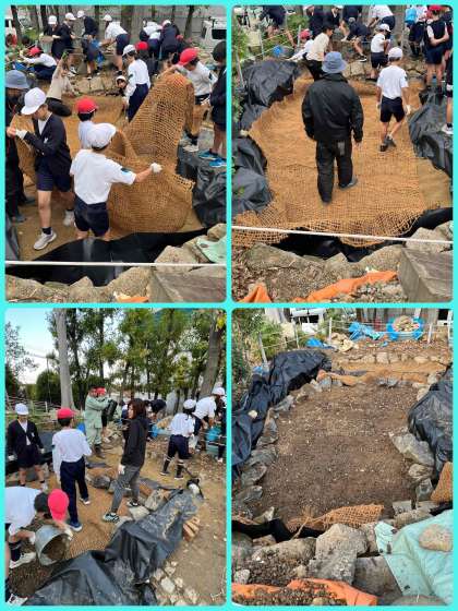 さらに自然の素材でできた袋をかぶせ、生き物がすめる場所をつくるための土砂を入れました。周りにも大きめの石を並べ、池の形になってきました。
