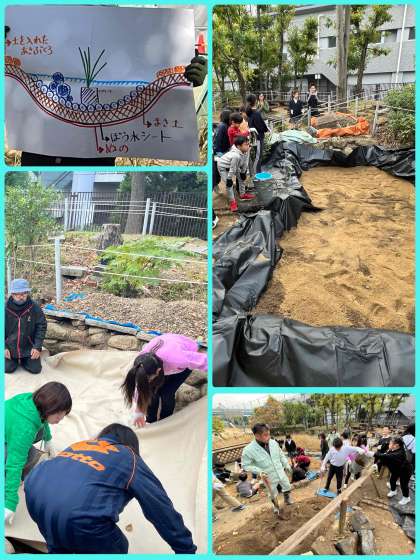 いよいよビオトープづくりが始まりました。まず、下に布を敷いて、その上に防水シートを敷いて、土を入れました。土はバケツリレーで協力しました。