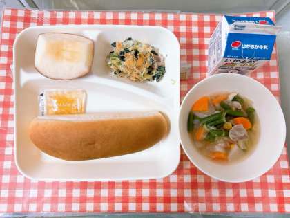 【ほうれんそうのグラタン、スープ煮、りんご、コッペパン、マーマレード、牛乳】