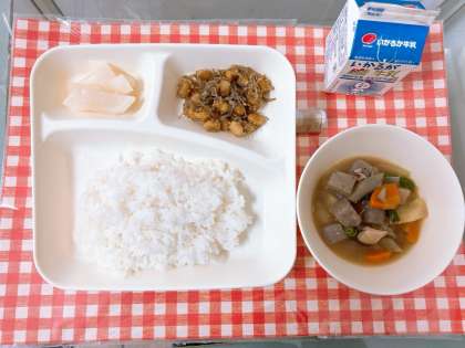 【鶏肉と野菜の煮もの、じゃこ豆、かぶのゆず風味、ごはん、牛乳】