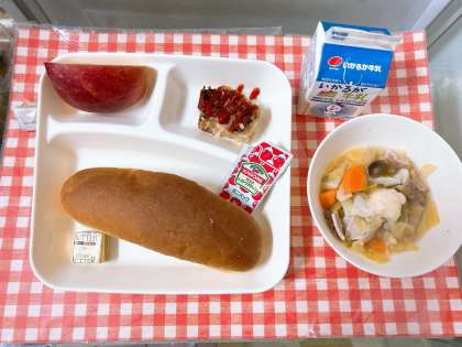 【とうふローフ、カリフラワーのスープ煮、りんご、コッペパン、バター、牛乳】
