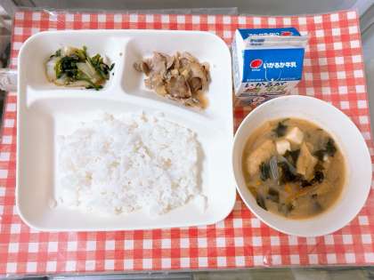 【豚肉のねぎじょうゆ焼き、みそ汁、きくなとはくさいのごまあえ、ごはん、牛乳】