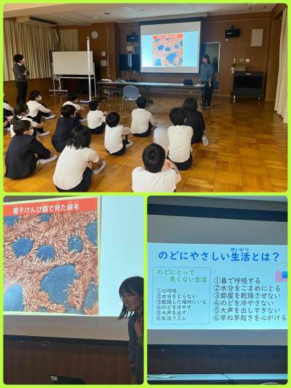 測定前に、養護教諭が「のどにやさしい生活とは?」というタイトルで、のどにやさしい生活についてみんなで考える保健学習を行いました。