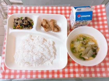 【鶏肉の甘みそ焼き、五目汁、高野どうふのいり煮、ごはん、牛乳】