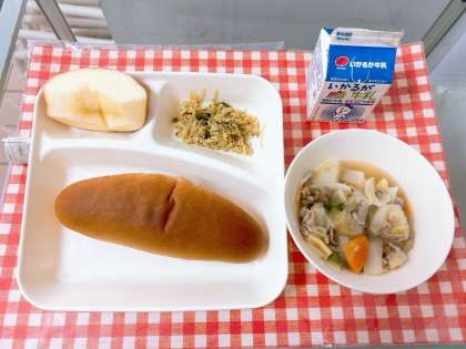 【豚肉と野菜のスープ煮、カレーソテー、りんご、黒糖パン、牛乳】