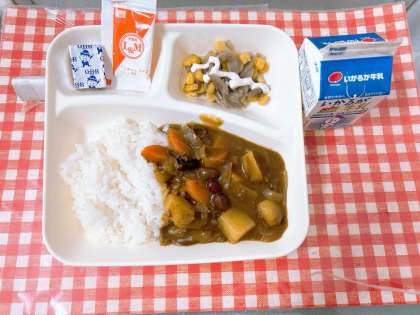 「牛肉と金時豆のカレーライス」は、じゃがいもやたまねぎ、にんじんなどの具材に加えて、食物せんいがたくさんふくまれている金時豆が入っています。カレールーの色と似ていて見つけられづらいですが、子どもたちは「お豆入ってるー!」と言いながら、おいしそうに食べていました。星型のラッキーにんじんが入っていた1年生が、「初めて入っていた!」と嬉しそうに教えてくれました。
