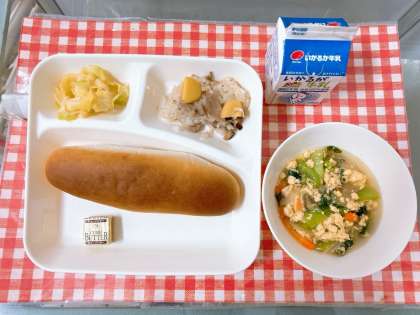 【中華おこわ、卵スープ、キャベツのオイスターソースいため、コッペパン、バター、牛乳】
