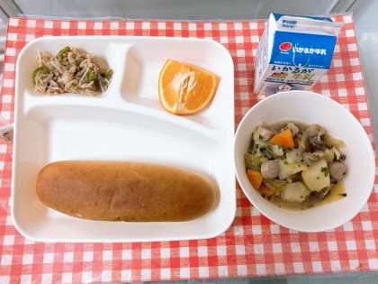 【ポトフ、ツナと野菜のソテー、いよかん、黒糖パン、牛乳】